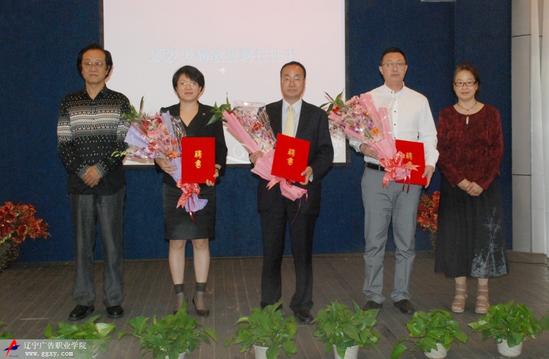 接下來由劉院長(zhǎng)宣讀遼寧廣告職業(yè)學(xué)院聘任決定:為提高我院師資力量,促進(jìn)專業(yè)科學(xué)建設(shè),經(jīng)院委會(huì)研究決定,聘任劉永生,李江,王健三名同志為我院專聘教授,宣讀完畢。由高院長(zhǎng)為專聘教授頒發(fā)聘任證書,2012級(jí)同學(xué)為專聘教授鮮花,院長(zhǎng)與三位教授合影留念。