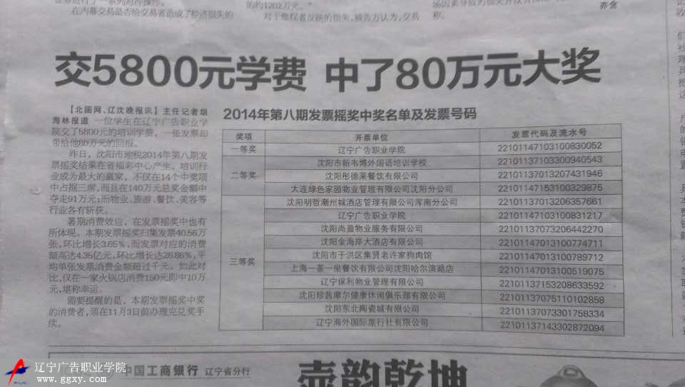 我院2012級(jí)商務(wù)管理系辦公文秘專業(yè)學(xué)生(營口大石橋地區(qū)),今年交納學(xué)費(fèi)的發(fā)票在沈陽地稅2014第0701期搖獎(jiǎng)中喜獲一等獎(jiǎng),獎(jiǎng)金為80萬元人民幣。據(jù)統(tǒng)計(jì)我院近兩年此類發(fā)票已有4人次中獎(jiǎng),最少獎(jiǎng)金為1萬元。