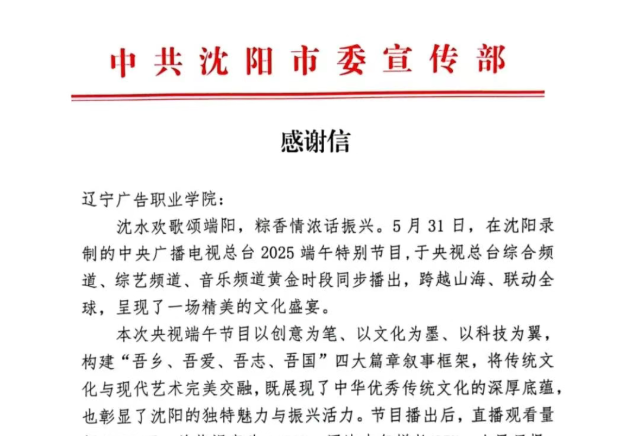 近日,遼寧廣告職業(yè)學(xué)院收到中央廣播電視總臺(tái)2025端午特別節(jié)目籌辦工作領(lǐng)導(dǎo)小組與中共沈陽(yáng)市委宣傳部聯(lián)合發(fā)來(lái)的感謝函。高度贊譽(yù)我院56名志愿者在端午特別節(jié)目中的貢獻(xiàn),以三重贊譽(yù)致敬職教擔(dān)當(dāng)與青年作為,表達(dá)最誠(chéng)摯的感謝和最崇高的敬意。這場(chǎng)全球矚目的文化盛宴里,遼廣院學(xué)子以專業(yè)素養(yǎng)與青春激情,為沈陽(yáng)文旅“破圈出彩”注入職教強(qiáng)音。